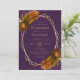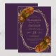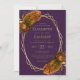 El diseño se caracteriza por un marco geométrico dorado decorado con ramos de acuarela de color naranja quemado, flores y follaje dorado, que rodean el texto dorado sobre un fondo violeta profundo. La parte trasera de la tarjeta es un tono morado a juego.
