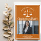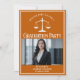 Esta invitación a la fiesta de graduación de la escuela de derecho naranja personalizado presenta tipografía blanca para una clase de graduado de 2025 por encima de su foto de estudiante. Personalizar con tu año de graduación bajo la escala de la justicia y fotografía para una gran invitación personalizada de abogado o abogado.