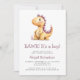 Esta tierna invitación a la ducha para bebés incluye un dinosaurio de color naranja y morado encima de las palabras "¡RAWR! ¡Es un niño!" en letra morada. Personalice el texto con el nombre de la futura madre en color púrpura y los detalles en el tipo de letra sans serif gris carbón. El reverso proporciona espacio para rifas de pañales, libros para bebés y detalles del registro, además de un cómodo código QR que los huéspedes pueden explorar para visitar el registro. Ideal para la ducha de bebé de un niño.