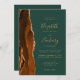 El borde izquierdo de esta elegante y moderna invitación a la boda incluye una acuarela naranja quemada bordeada por un falso purpurina de oro. El texto del personalizable combina la escritura a mano de color dorado, las fuentes de copperplate y cursiva sobre un fondo verde oscuro. El reverso proporciona espacio para los detalles del boda sobre un fondo verde oscuro sólido, junto con un código QR que los huéspedes pueden explorar para visitar su sitio web y RSVP, lo que ahorra el coste de imprimir y enviar tarjetas RSVP separadas.