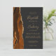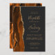 El borde izquierdo de esta elegante y moderna invitación a la boda incluye una acuarela naranja quemada bordeada por un falso purpurina de oro. El texto del personalizable combina la escritura a mano de color dorado, las fuentes de copperplate y cursiva en un fondo oscuro fuera de negro. En el reverso se encuentra un naranja quemado a juego y un diseño de agate dorado.