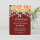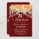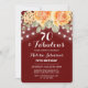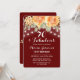 La elegante invitación de cumpleaños floral incluye impresionantes rosas naranjas de acuarela, ramo con luces de cuerdas en el fondo borgoñón.