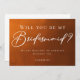 Siga la tendencia de otoño de tonos tierra con nuestro naranja quemado a la caída de gradiente marrón Will You Be My Bridesmaid invitación. Tipografía blanca simple sobre un fondo rústico para un aspecto minimalista. Los tonos bohemios que recuerdan a la arcilla de terracota resaltan su elegante caligrafía en esta moderna tarjeta de presentación del partido de novias con textura de color.