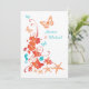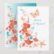 Si estás planeando una boda de destino tropical y estás buscando una invitación a una boda con ambiente oceánico, entonces este hermoso diseño floral azul turquesa o verde azulado y naranja brillante con flores tropicales, mariposas, conchas, pez estrella y caballos de mar seguro será un éxito entre familia y amigos. Esta invitación a bodas todo en uno para un destino tropical en azul y naranja vibrante tiene detalles de RSVP en la parte trasera, haciendo de esto una opción asequible y magnífica!