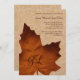 En un fondo de color burpomposo, una gran hoja monogramada de arce acentúa esta invitación al damasco floral, para la boda vintage. Se muestra en el papel básico; sin embargo, recomiendo el peso y textura del papel de lino.