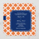 Patrón de quatrefoil blanco y naranja con invitaciones de boda azul real. patrón de quatrefoil naranja sobre blanco.