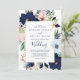 Esta moderna tarjeta náutica floral es perfecta para una boda de crucero o de playa. El diseño es llamativo, con flores de color rosa y azul marino con acentos dorados de estrella de mar, lo que le da un ambiente de playa.