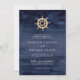 Esta moderna invitación a la boda es perfecta para un crucero o una boda en la playa. El diseño es sencillo, con una rueda de barco dorado sobre un fondo acuático azul marino.