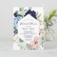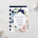 Este moderno ensayo náutico floral es perfecto para un ensayo de bodas en la playa. El diseño es llamativo, con flores de color rosa y azul marino con acentos dorados de estrella de mar, lo que le da un ambiente de playa.