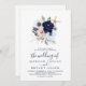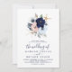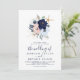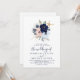 Esta moderna invitación a una boda acuática floral es perfecta para un crucero o una boda en la playa. El diseño es llamativo, con flores de color rosa y azul marino con acentos dorados de estrella de mar, lo que le da un ambiente de playa.