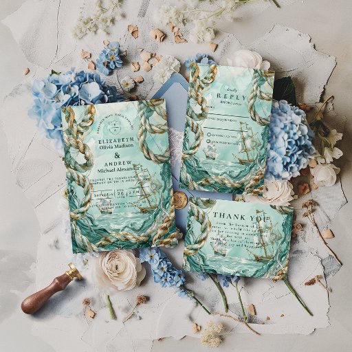 Set the tone for an unforgettable seaside celebration with this enchanting nautical-themed wedding design. Featuring weathered teal waters, drifting rope details, and a vintage sailing ship emerging through soft coastal mist, this artwork blends romance with maritime adventure. Perfect for couples who feel at home by the sea, it brings together textured ropes, washed-shore color palettes, and fine hand-drawn elements that create a refined yet dramatic coastal atmosphere. Elegant typography completes the composition, making this invitation ideal for beach weddings, harbor ceremonies, or ocean-inspired celebrations.