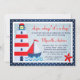 Invitación a la ducha de bebé para niños con tema de vela. Un polka azul y blanco profundo del océano sigue un patrón en el fondo; Ilustrado con un velero, una estrella de mar y un faro. Escrito "barcos ahoy! ¡Es un niño!". Algunos elementos de Baby Star Design.