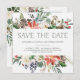 Estas elegantes tarjetas de guardar la fecha de boda para las fiestas cuentan con flores rústicas pintadas con acuarela con piñas, ramas, bayas, hojas y rosas blancas. Tu foto aparece en la parte trasera con más flores.