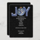 Invitación de fiesta de vacaciones con texto JOY en copos de nieve y ornamento planeta tierra sobre negro.