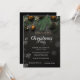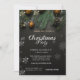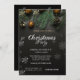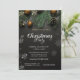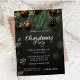 Una elegante invitación de fiesta de vacaciones con ramas de pino Navidades y bolas de Navidad sobre fondo negro. Estas hermosas invitaciones a Navidades son perfectas para Navidades que invitan a cenar, invitaciones de intercambio de regalos de vacaciones, recaudaciones de fondos para Navidades, invitaciones para fiestas de vacaciones y otros eventos que se llevan a cabo durante el mes de diciembre. Utilice los campos de plantilla para agregar su propia información de eventos.