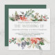 Estas elegantes invitaciones de bodas vacacionales cuentan con flores de acuarela rústicas con pinecones, ramas, bayas, hojas y rosas blancas.