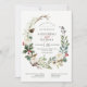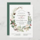Estas elegantes invitaciones a bodas vacacionales incluyen una corona de color rústico con pinecones, ramas, bayas, hojas y rosas blancas.