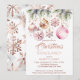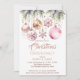 Navidades cena fiesta boho rosa metálico plata oro planilla de acuarela invitación descarga instantánea, ramas de pino con copos de nieve rosa de oro baubles