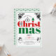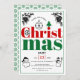 Invitación de fiesta de vacaciones de vintage elementos de Navidad. Este diseño festivo muestra la palabra "Navidades" en dos partes de tipografía negrita roja y verde y varios elementos: copo de nieve, ornamento de bola de Navidades, santa Claus, muñeco de nieve, ramas de pino con conos de pino y un árbol. También hay un borde verde a su alrededor. La parte trasera incluye un patrón de copos de nieve verdes sobre fondo blanco.