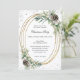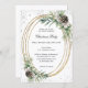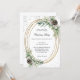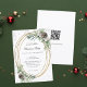 Un fondo blanco. Marco dorado falso ovalado decorado con conos, berros blancos y vegetación de pino. Purpurina de plata falsa, chispas. Personalice y agregue los detalles. Texto negro. Código QR en su sitio web para obtener información sobre RSVP y fiesta.