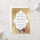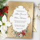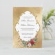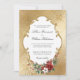 Crea una inolvidable boda de invierno con este elegante diseño de invitaciones vacacionales con un exuberante spray de Navidades rosas, poinsettia, holly y pino, etiqueta blanca con un borde dorado ornamental y un opulento fondo de damasco de gradiente de oro metálico falso. Incluye un escudo de oro personalizado con campos de texto iniciales.