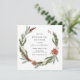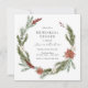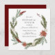 La invitación a cenar con temática boda de invierno incluye un marco de corona de color agua de evergreen, poinsettias y pinecones. Personalice su información o haga clic en "Haga clic en el personalizar más adelante" para editar estilos de fuente, tamaño y colores.