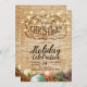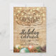 Fiesta navidades / Tarjetas de invitación para celebraciones navideñas - Rústico texto de madera tallada, bolas de Navidades, luces de cuerda, rama de árbol de pino y copos de nieve.
