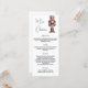 carta fiesta para la cena de los navidades. Personalice y agregue un nombre/evento, fecha y menú. Un fondo rojo, texto blanco. Decorada con un petaca rosado polvoriento. Texto: Feliz Navidad