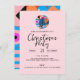 Vibrante invitación a un partido de Navidades modernos, rosa y azul. Diseño de tipografía elegante con un diseño geométrico rosa y azul oscuro con un árbol de Navidad central con baudillos.