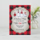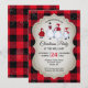 Esta encantadora invitación del Partido de los Navidades incluye a una familia de hombres de nieve patinando juntos en un fondo beige bordeado por búfalos rojos y negros cubiertos de nieve en caída. Diseñado por la artista ©Susan Coffey.