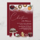 Fiesta Navidad o cena. En un fondo rojo festivo con nieve, se ofrecen Navidades como vino a la parrilla, pasteles de menta, pan de jengibre, pasteles de Navidad y dulces.