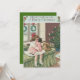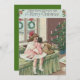 Es hora de celebrar las fiestas. Esta imagen vintage de Navidad muestra la mañana de los Navidades de una niña. Incluye un árbol de Navidad, corona, muñeca y otros regalos.