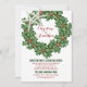 Dos estrellas decoran la gran corona hueca. El texto personalizado alterna el rojo oscuro y el verde. Texto impreso moderno en letras fundas superiores con los nombres de la novia y el novio en la parte superior, en el centro de la corona.