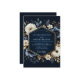 A dramatic navy backdrop is adorned with a lavish display of creamy white and soft blue blossoms. Golden accents add a touch of sparkle amidst lush foliage and delicate floral sprays. This design evokes a feeling of refined opulence for a memorable occasion.