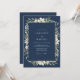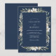 Deep navy blue provides a sophisticated backdrop for this design, which features a delicate arrangement of white anemones and sage green leaves. The crisp contrast of watercolor florals creates a serene and timeless aesthetic. This botanical artwork offers a classic and refined look suited for a formal winter event.