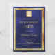 Celebrate the special milestone with this elegant retirement party invitation. Featuring a rich navy blue background with an uneven texture, this design is highlighted by a faux gold frame. The golden-colored lettering adds a touch of sophistication, making it perfect for the occasion. Personalize it by adding your business logo, the retiree's name and all your party details to create a truly unique invitation.