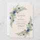 This design features a delicate arrangement of navy blue wildflowers and lush sage green foliage. Hand-painted watercolor eucalyptus and textured ferns create a natural, organic border against a soft cream backdrop. The palette is airy and sophisticated, making it ideal for an elegant outdoor event during the warmer months.