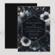 A moody aesthetic defines this design with a deep palette of navy blue and charcoal tones. Elegant white anemones contrast against lush charcoal roses and intricate foliage. Delicate gold accents provide warmth amidst the cool, nocturnal botanical scenery. The atmosphere is one of mysterious romance and sophisticated winter beauty.