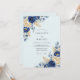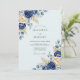 This design showcases a sophisticated blend of deep navy blue and shimmering gold tones set against a crisp background. Hand-painted watercolor roses and lush greenery create an atmosphere of timeless elegance. Eucalyptus leaves and delicate berry sprigs accent the botanical arrangement for a polished look.