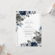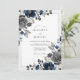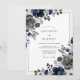 Deep navy blue and slate gray watercolor florals create a sophisticated and moody atmosphere. Large anemones with dark centers are paired with lush roses and delicate sprigs of silver eucalyptus and berries. This cool color palette and the intricate botanical details evoke a formal aesthetic perfect for a cold-weather event.