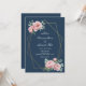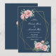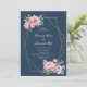 This navy blush peony gold frame wedding collection features a rich deep navy blue background, paired with delicate blush pink peony blooms and lush eucalyptus greenery, framed by elegant double gold geometric borders. The design blends timeless calligraphy script with refined serif typography, creating a romantic, sophisticated tone perfect for classic, French country, or garden-style weddings.