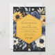 This elegant design features a dramatic floral arrangement against a dark backdrop. Vibrant golden sunflowers and deep blue roses create a stunning visual contrast. Touches of white anemones and silvery-green foliage complete this lush, romantic botanical composition for a sophisticated union.