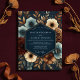Deep navy tones are enriched with opulent blooms in cream, rust, and muted blue hues. This design evokes a sense of refined elegance with its lush, painterly floral arrangements and rich color palette. The artistic composition suggests a sophisticated, dramatic aesthetic for a memorable occasion.