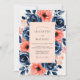 This design features a lush arrangement of painterly navy blue roses and vibrant coral anemones. The watercolor blooms create a bold yet romantic atmosphere, perfect for a sophisticated seasonal event. Deep blue foliage and soft blush accents complement the striking floral motif, offering a modern artistic aesthetic.