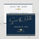 Una tarjeta de Invitación Navy and Gold Elegant Save The Date Boda, diseñada con texto dorado, guarnecido y acento cardíaco, sobre un fondo naval. El texto incluye: Save The Date, The Bride and Groom's First Names and Boda Date. El lado inverso está diseñado con texto de color marfileño y recortado sobre un fondo blanco con acento cardíaco de color dorado. El texto inverso incluye: Save The Date, The Bride and Groom's full name, Are Get Casried!, la Fecha Boda y la Invitación formal a seguir. Para personalizar, simplemente inserte sus detalles en nuestra plantilla sencilla, reemplazando el texto de ejemplo.
