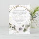 Invitación en papel 5x7, imágenes a dos lados y texto para invitaciones de boda. Hay una suite completa para invitados a la boda. Corona de sauce sencilla y elegante con hojas de helado y eucalipto con aliento de bebé y flores anémonas blancas. El fondo es blanco (pero se puede cambiar). En el reverso hay un suave patrón de gris de paloma caliente con una franja de hojas de follaje (se puede cambiar este color de fondo si se desea). Derechos reservados Audrey Jeanne Roberts, derechos reservados.