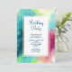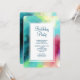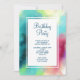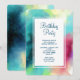 Invitación a la fiesta de cumpleaños con un diseño abstracto elegante y fresco. Las acuarelas se mezclan y se mezclan para crear la ilusión de una imagen espacial. El verde con toques de color violeta, amarillo y rojo claro se funde con un toque de puntos blancos y estrellas. Una elegante creación artística.