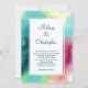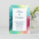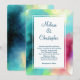 Invitación a la boda con un diseño abstracto elegante y fresco. Las acuarelas se mezclan y se mezclan para crear la ilusión de una imagen espacial. El verde con toques de color violeta, amarillo y rojo claro se funde con un toque de puntos blancos y estrellas. Una elegante creación artística.