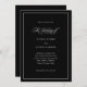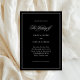 Esta elegante y oscura invitación a la boda negra presenta un estilo clásico de antaño con caligrafía romántica. Todos los detalles de su boda están rodeados de un moderno marco blanco delicado. Fije el tono de su boda lujoso y sofisticado de inspiración italiana con este elegante diseño minimalista.