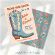 Guarda la fecha de arranque occidental de Cowboy con fuentes divertidas y una atmósfera retro mod. Cuenta con una funda de vaquero con colores divertidos de rosa, naranja, azul y muy claro toque cremoso de blanco rosado. ¡Perfecto para que venga un boda de temática occidental de cowboy country! Se puede cambiar toda la redacción, salvo la palabra "conseguir un golpe". Mano dibujada por McBooboos. Para realizar más cambios, vaya a Personalizar esta plantilla. En la parte inferior verás "¿Quieres personalizar este diseño aún más? Haga clic en la herramienta EDIT using Design. Tomará algo de aprendizaje, pero puede cambiar algunos de los tipos de letra y algunos colores, mover las cosas o borrar lo que necesita. Lo cogerás.